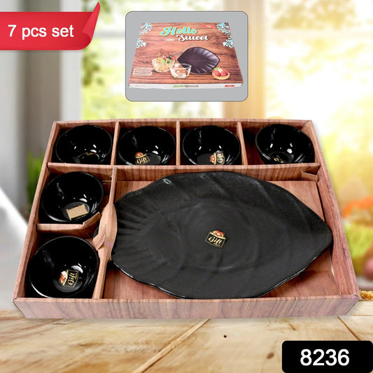 Hello Sweet Round Ceramic Snacks Bowl With Plastic Leaf shape Serving platter Portable, Lightweight Breakfast, Serving Bowl | Ideal for Rice, Pasta, Desserts Home & Kitchen Serving Bowl & platter (7 Pcs set)